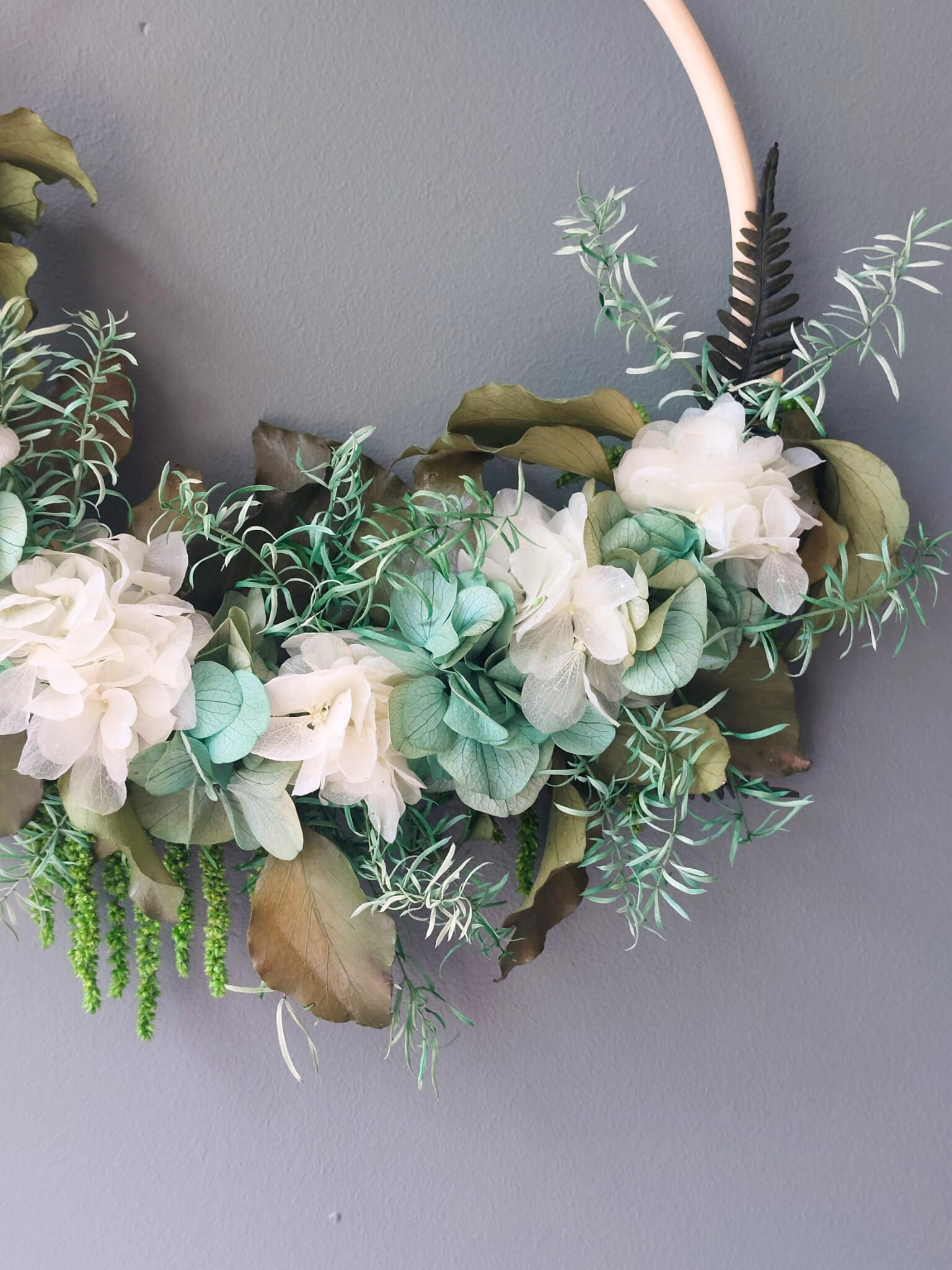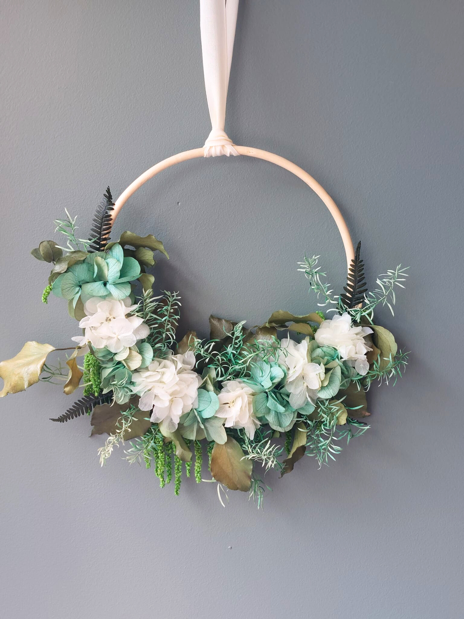 Jade, cette couronne en fleurs séchées et stabilisées réalisée par Sœurettes est une évocation de la pierre précieuse qui porte le même nom.