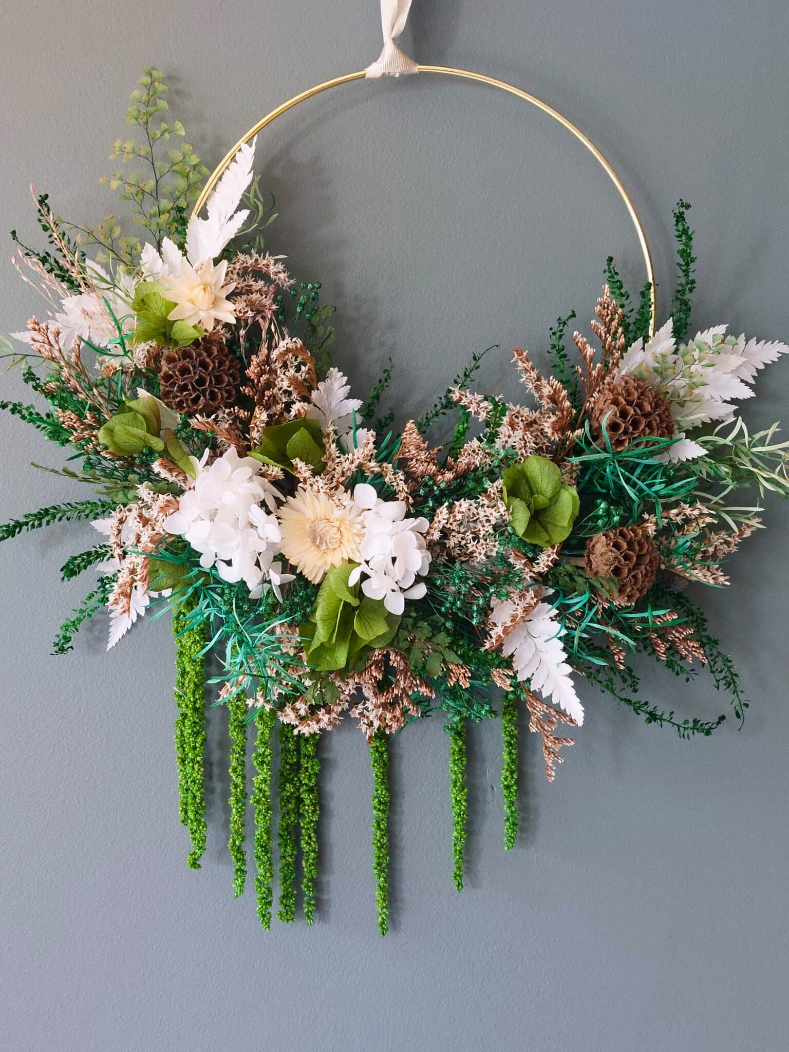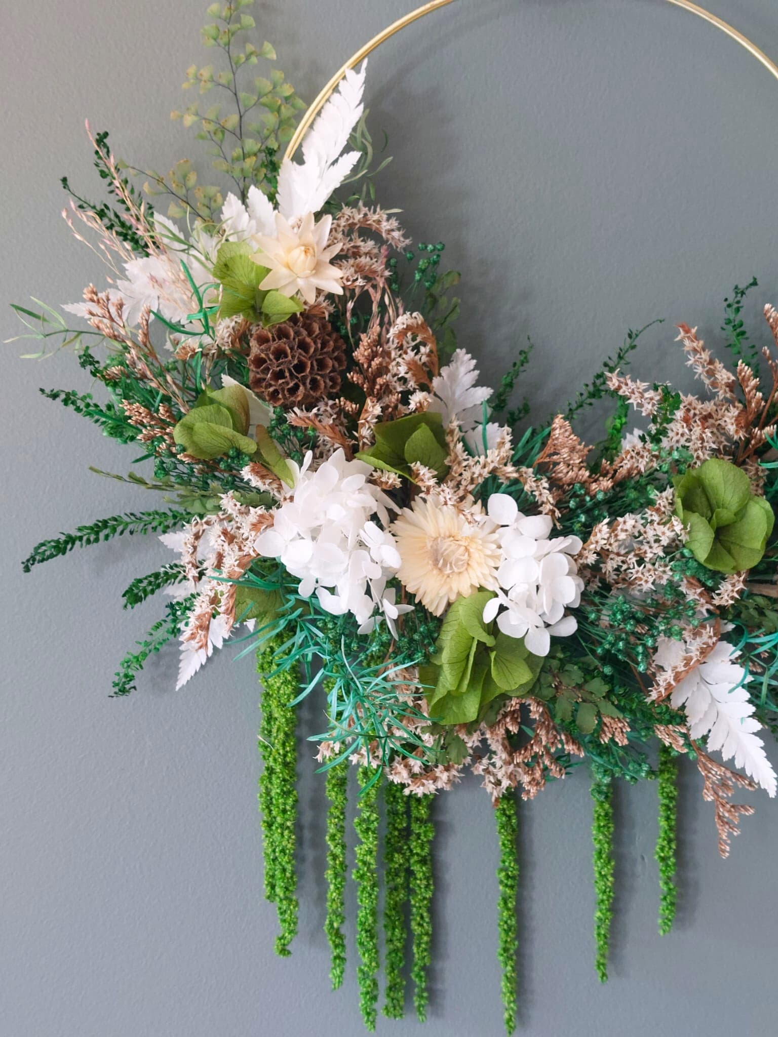 Réalisée avec des fleurs séchées et stabilisées, Liane est une couronne murale qui fait la part belle à l’amarante qui tombe en cascade.