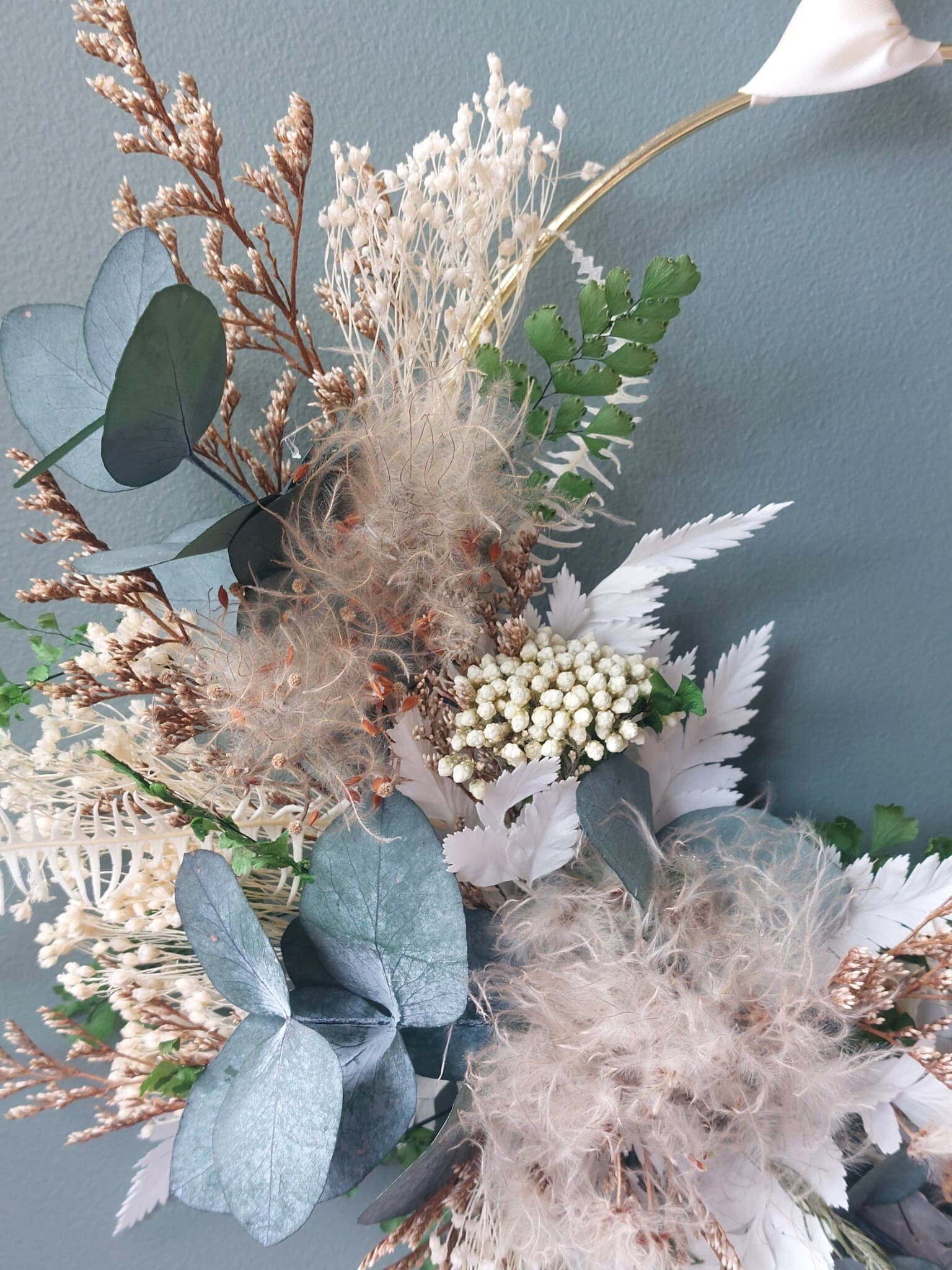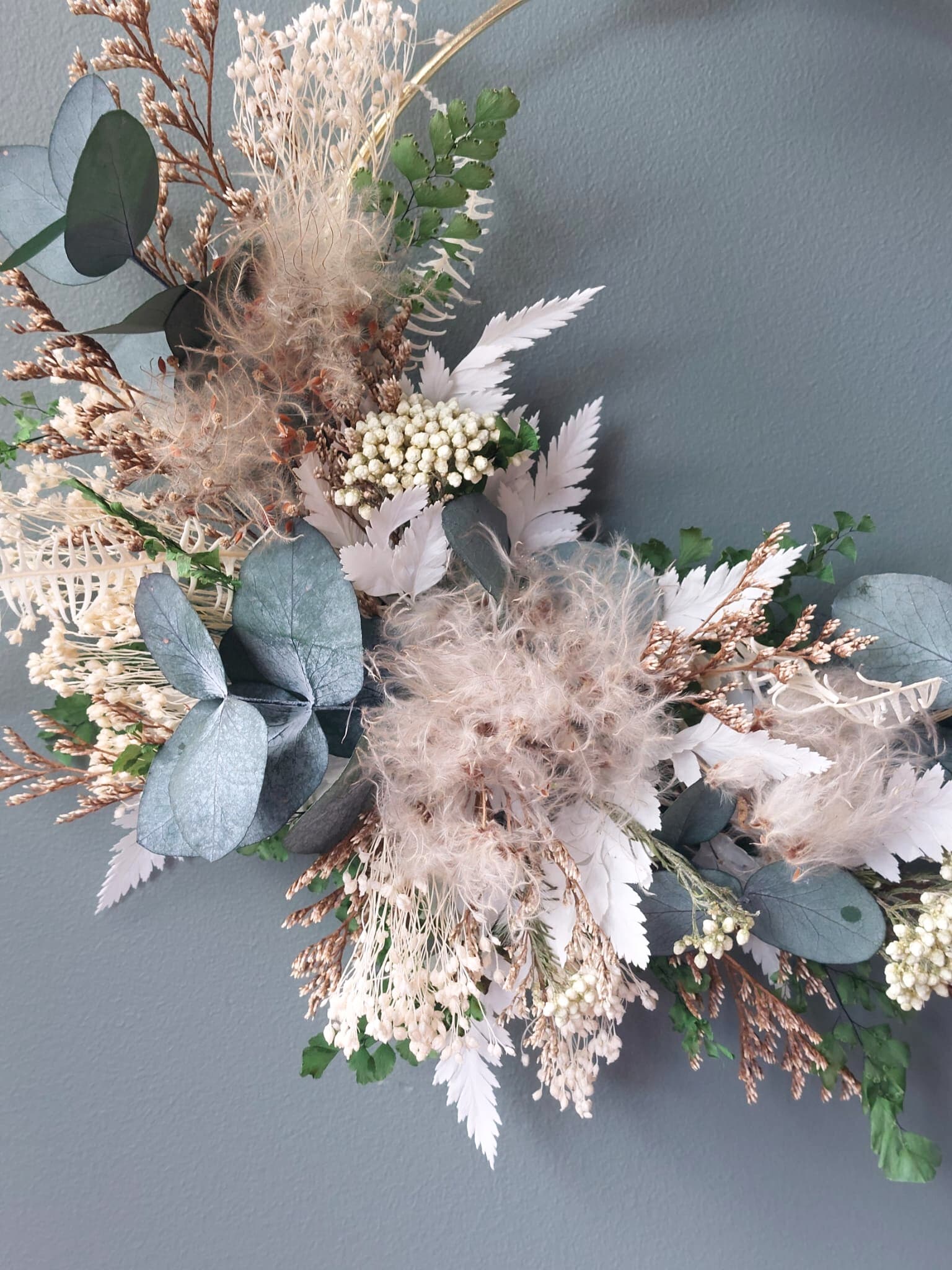 Mousse est une couronne de fleurs séchées délicate. Une couronne murale en apesanteur, qui met la clématite en valeur.