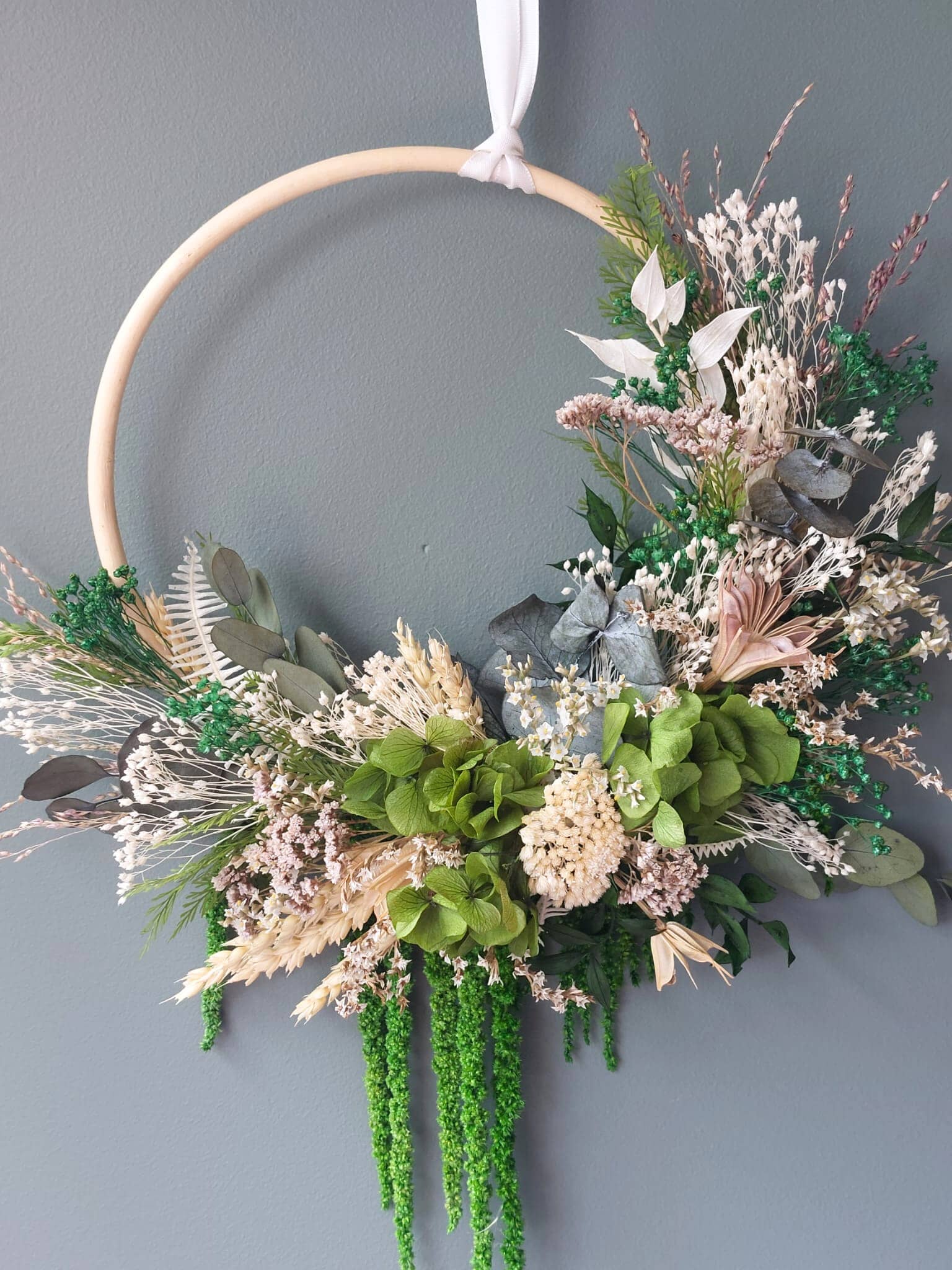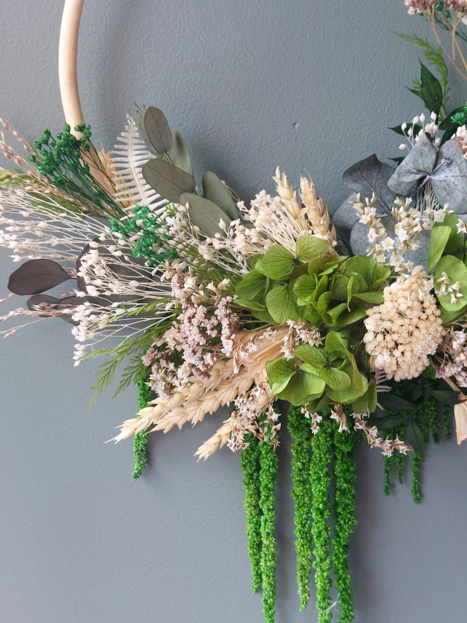 Ornée de fleurs séchées et stabilisées, cette suspension apportera une touche sauvage et végétal à votre décoration.