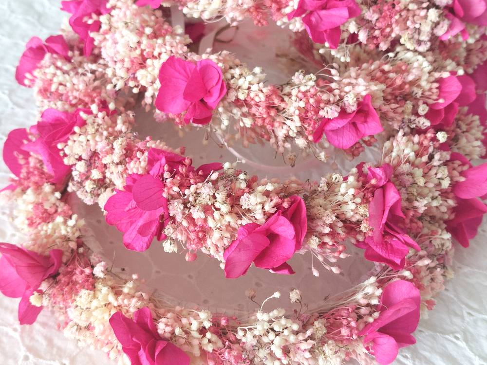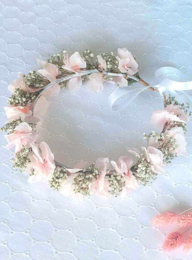 Parfaite pour un mariage, une cérémonie laïque, une communion ou un baptême, la couronne en fleurs séchées est un grand classique qui allie poésie et élégance.