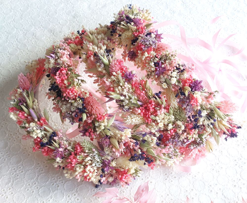 Disponibles sur commande, les couronnes en fleurs séchées pour les cheveux réalisées par Sœurettes se déclinent dans les couleurs de votre choix et sont montées sur un joli ruban coordonné.
