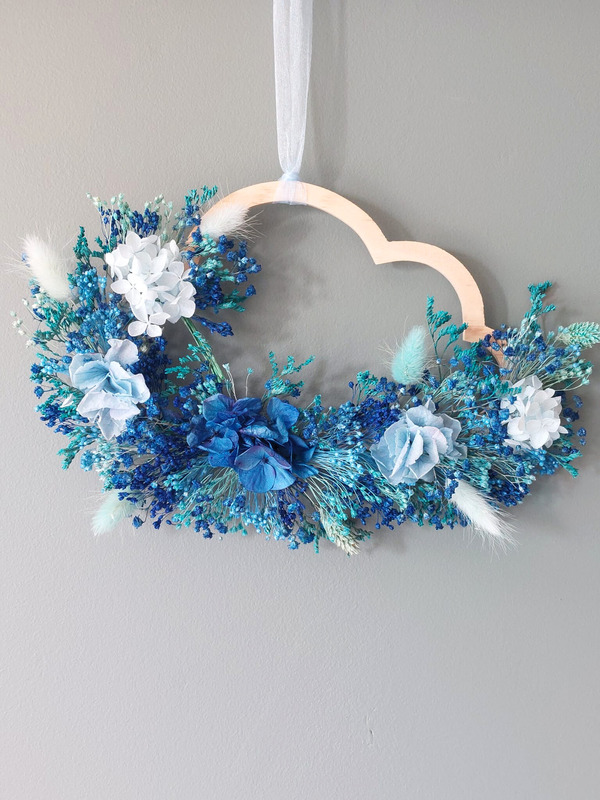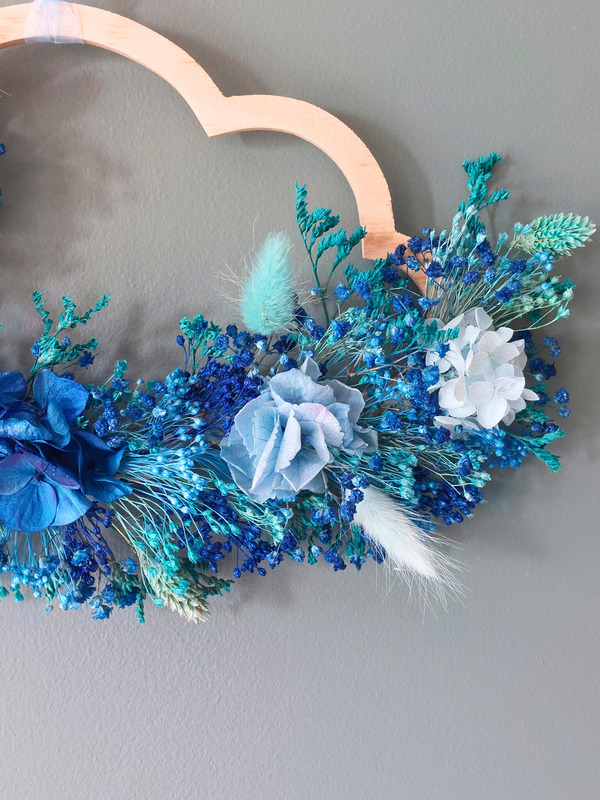 La poésie sous forme de nuage, orné de fleurs séchées et stabilisées déclinées dans les tons bleus.