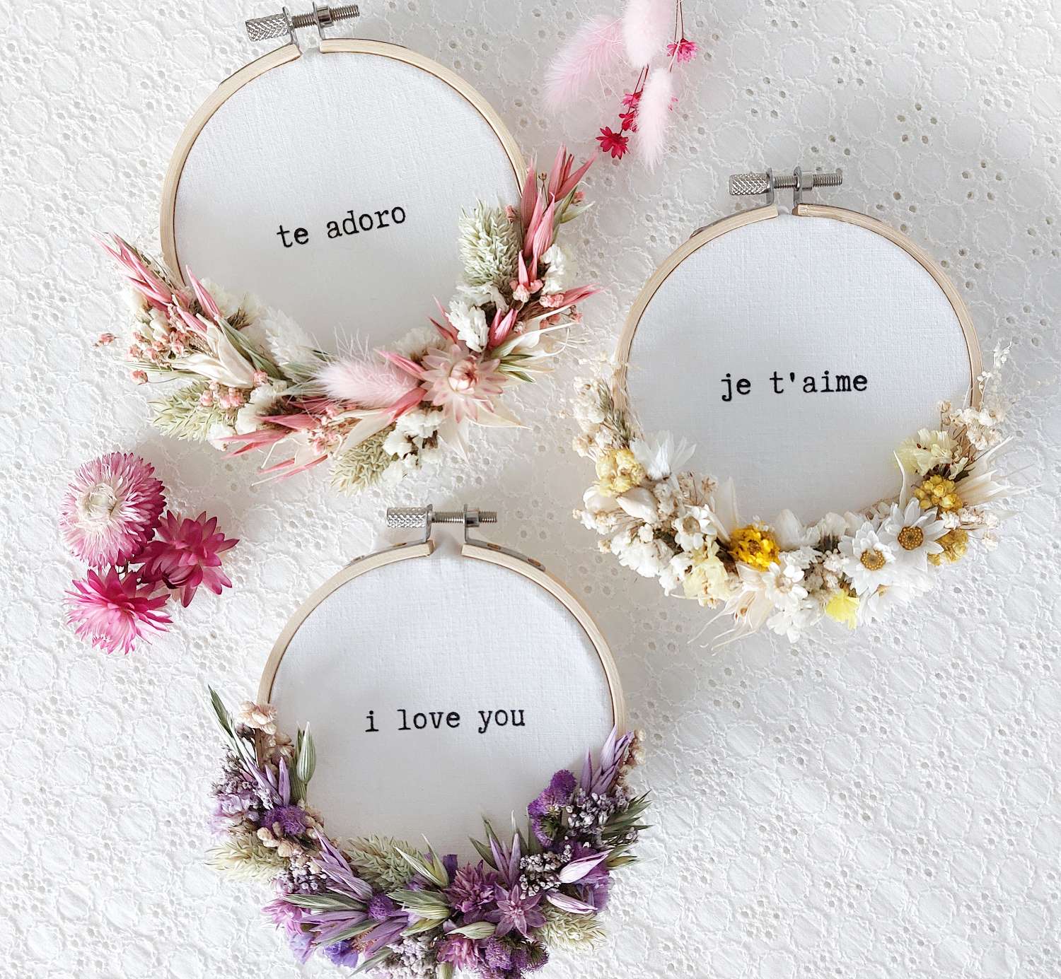 Réalisé sur un tambour à broder de 10 cm de diamètre, chaque mini-tambour peut être décoré des fleurs séchées de votre choix, et personnalisé du texte, inscrit sur du tissu recyclé, dont vous seul(e) aurez le secret… Un prénom, un mot doux, un message codé… Tout est faisable, dans la limite de la taille du cercle de 10 cm, forcément imposée !